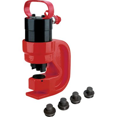 This hydraulic hole punch makes a perfect hole in sheet metal up to 3/8in. thick with less trouble than a drill and less effort than a hand-operated model. Pieces (qty.): 5, Hole Punch Sizes: 7/16in., 1/2in., 5/8in. and 3/4in., Hole Punches (qty): 4, Storage Bag Included: No, Storage Case Included: No